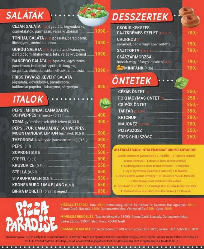 A tatai Pizza Paradise nevéhez hűen pizzák széles választékát kínálja megrendelőinek.